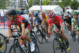 1周4キロを30周する3時間弱のコース。レース序盤から「チーム右京」「宇都宮ブリッツェン」といった強豪チームの選手4人が,30人ほどの大集団から飛び出した。これを「逃げ」というのだが,「逃げ」た選手は通常,圧倒的な空気抵抗のせいで徐々に体力を奪われる。一方で後続のメイン集団は先頭選手の交代を繰り返して体力を温存し,レース最終盤で逃げた選手を抜き去るのが一般的なパターンだ。