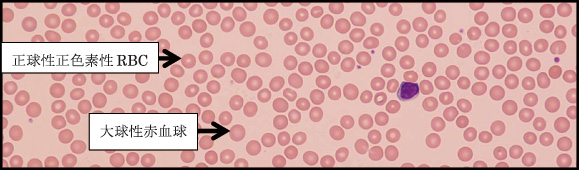 MCV:94.2と正常値(90.0)からすると軽度の大球性赤血球を認める。