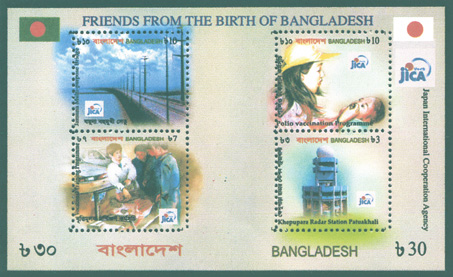 日本との友好(連刷4種):上左から ジャムナ多目的橋(鉄道を含む),ポリオワクチンの投与