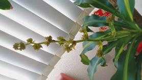 31年目の今回は偶然丈の低い木に蕾を見つけたため,2カ月間幸福の木の花を観察することができた。親木にも蕾が見つかり,遅れてもう1本の鉢にもっと若い蕾を見つけ,その初々しさに感激した。