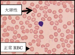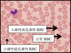 末梢血液像:RBC形態は大小不同を軽度に認める。