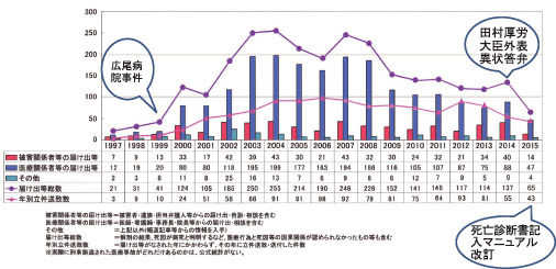 医療事故調査制度施行から約4カ月後,制度見直しの必要性の有無が検討されていた。2016年(平成28年)2月24日,突然,日医が,「医師法第21条及び同第33条の2に対する改正案の提言」を発表した。医師法第21条を「医師は,死体又は妊娠4月以上の死産児を検案して犯罪と関係ある異状があると認めたときは,24時間以内に所轄警察署に届け出なければならない。」とし,同33条の2(罰則)から第21条違反を削除するというものである。日医の改正案は,死体解剖保存法に倣ったものと思われる。死体解剖保存法第11条は,「死体を解剖した者は,その死体について犯罪と関係のある異状があると認めたときは,24時間以内に,解剖をした地の警察署長に届け出なければならない。」としており,これには罰則規定はない。この日医提言は,一見,警察への届け出対象を制限して医療現場の負担を減らすかのように思われる。ところが,これは大きな間違いである。臨床現場では,逆に負担増になってしまう。何故であろうか。死体解剖保存法の対象は当然,死体である。解剖の過誤で,業務上過失致死罪の適用などあり得ない。一方,医師法の対象は生きた人間である。現状の日本の法律においては,診療上の過誤は,業務上過失致死罪の適用になり得る。業務上過失致死罪は犯罪類型である。これを考えると,日医案の「犯罪と関係ある異状」となれば,業務上過失致死罪の疑いが全て届け出対象となり,届け出対象の大幅な拡大を招く。医療崩壊時の全例届出状況に逆戻りする医師法第21条の改悪である。そもそも,医師法第21条の届け出義務を負うのは,検案した医師であり,医療行為を行った医師と同一人である場合が多い。自ら行った医療に業務上過失致死罪の可能性があるにもかかわらず届け出義務を課すということは,基本的人権である憲法第38条第1項の自己負罪拒否特権に正面から抵触するというべきである。日医案は憲法違反規定であろう。医師法第21条のみの単独改正は結果として改悪になりかねないのである。図1は医療事故の警察への届出件数,立件件数をグラフにしたものである。医師法第21条の外表異状の理解とともに,現在,警察届出件数は,都立広尾病院事件以前の状況に回帰している。この状況での医師法第21条単独改正提案はピント外れと言うべきであろう。