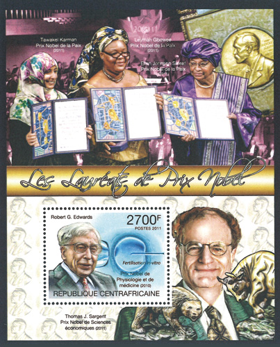 切手にロバート・G・エドワーズ(医学賞)と体外受精の様子