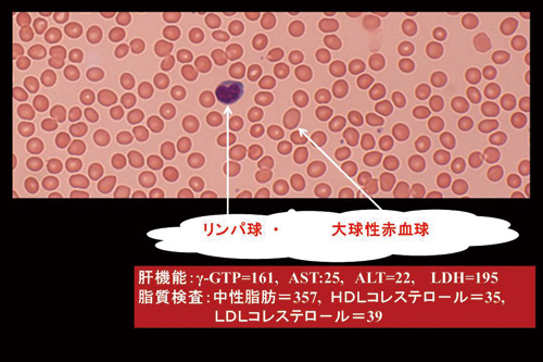 飲酒歴が長いとMCVが100以上の大球性となります。大球性の病態は肝障害,脂質異常症,ビタミンB12欠乏そして生化学的には赤血球膜脂質量の増加2)によると考えられています。この症例のビタミンB12は182pg/mLと低下していました。