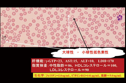病歴:以前から健診で貧血の指摘あり。不眠のため,毎晩飲酒で入眠。