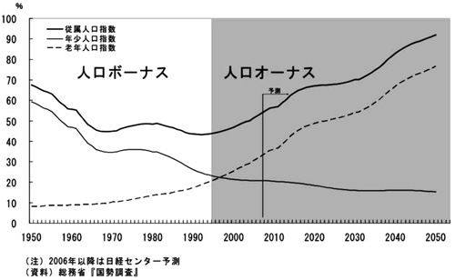 まさに,日本は世界でも類を見ない少子,超高齢社会を迎えつつある。インターネット等を検索すると,経済学者や経済産業省等から“人口ボーナスと人口オーナス”と題した情報が,数多く発信されている。人口ボーナス,オーナスは経済用語であり,ある社会が「多産多死」の社会から「少産少子」社会に切り替わる際,人口構成比の子供が減り,生産年齢の人口が多くなった状態を人口ボーナス期と呼ぶということである。その時代は高齢者が少なく,労働力が豊富なため,社会保障費が少なくてすみ,経済発展をしやすいとされ,現在の中国,シンガポールやタイがそれにあたるという。日本の人口ボーナス期は,1960年ごろから始まり,90年ごろすでに終わっており,そして一度人口ボーナスが終わると,二度とこないとも述べられている。それに対し,人口オーナスというのは,人口構成の変化が経済にとってマイナスに作用する状態であり,働く人よりも支えられる人が多くなる状況と説明されている。オーナス(onus)とは,「重荷,負担」という意味で,日本では,少子高齢化が顕著になってきた90年ころから人口オーナス期に入ったとされており,まさに高度成長期からバブル期,そしてバブルの破綻は,経済学的には必然でこれからの人口オーナス期には,団塊世代が世の中の「重荷,負担」になるとも読み取れる(図1)。