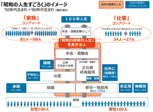 他に,最近インターネットで注目を浴びている話題に,平成29年5月に経済産業省の事務次官,若手プロジェクトより出された「不安な個人,立ちすくむ国家−モデル無き時代をどう前向きに生き抜くか−」と題した提言がある。これは,1950年代生まれと1980年代生まれの人生を比較し,サラリーマンと専業主婦で定年後は年金暮らしという「昭和の人生すごろく」のコンプリート率(達成率)はすでに大幅にさがっており,早急な社会システムの改革の必要性を訴えたものである。そこでは1950代生まれの標準的生き方を「昭和の人生すごろく」と題し,学校卒業後は新卒一括採用で正社員になり定年まで勤め上げる,その後は年金・退職金暮らしという「仕事」コンプリート,そして結婚して,出産して,添い遂げるという「家族」コンプリートはすでに大幅に下がっており,「昭和の標準的でない(?)人生」への社会システムの大転換が待ったなしになっていると訴えている(図2)。確かに日本の将来を考えると,根本的な社会システムの変革が必要な事には全面的に同意するが,国民に危機感を持ってもらいたいという強いメッセージではあるが,少し乱暴な分析と感じるし,医療・介護などの社会保障を経済学的効率化の観点からだけで議論するのはいかがなものかとも思う。世界一の長寿国に日本を押し上げたのは,日本の医療システムと医療従事者の献身的努力によるものと考えるし,少なくとも日本の高度成長を支えた世代に失礼だという気持ちを感じてしまう。一読すると,若手官僚の危機感をもった熱い志を感じたが,前提に高齢者向け予算をカットするという方向性があり,何か上から目線の提言に思えてしまうのは私だけでしょうか?