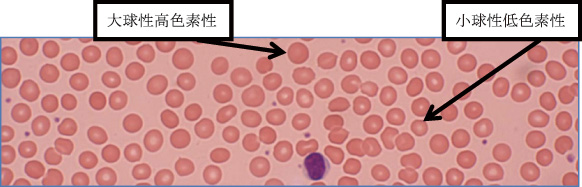 図 1 症例1の初診時,末梢血液像は大小不同1+あり,多染性1+です。