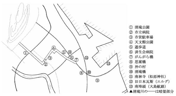 清滝川という名は如何にも清流を思わせる上品な名前だが紅葉で有名な桂川の支流として京都にも存在する。鹿児島のそれは城山を水源として市中を流れて城南町で錦江湾に注いでいる。