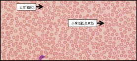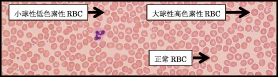図 2 末梢血液像:RBC形態は小球性低色素性RBCが目立つ。大小不同を認める。