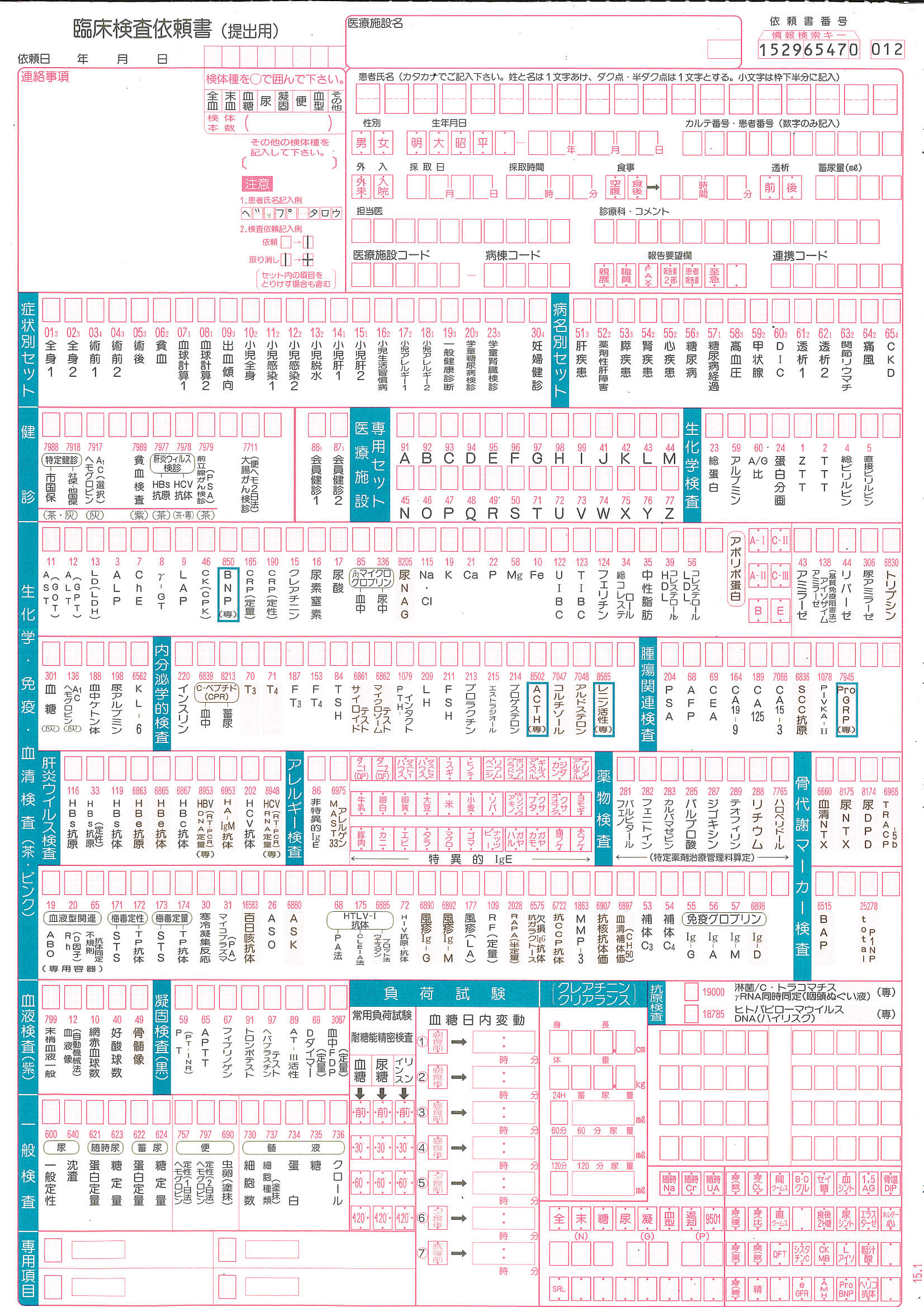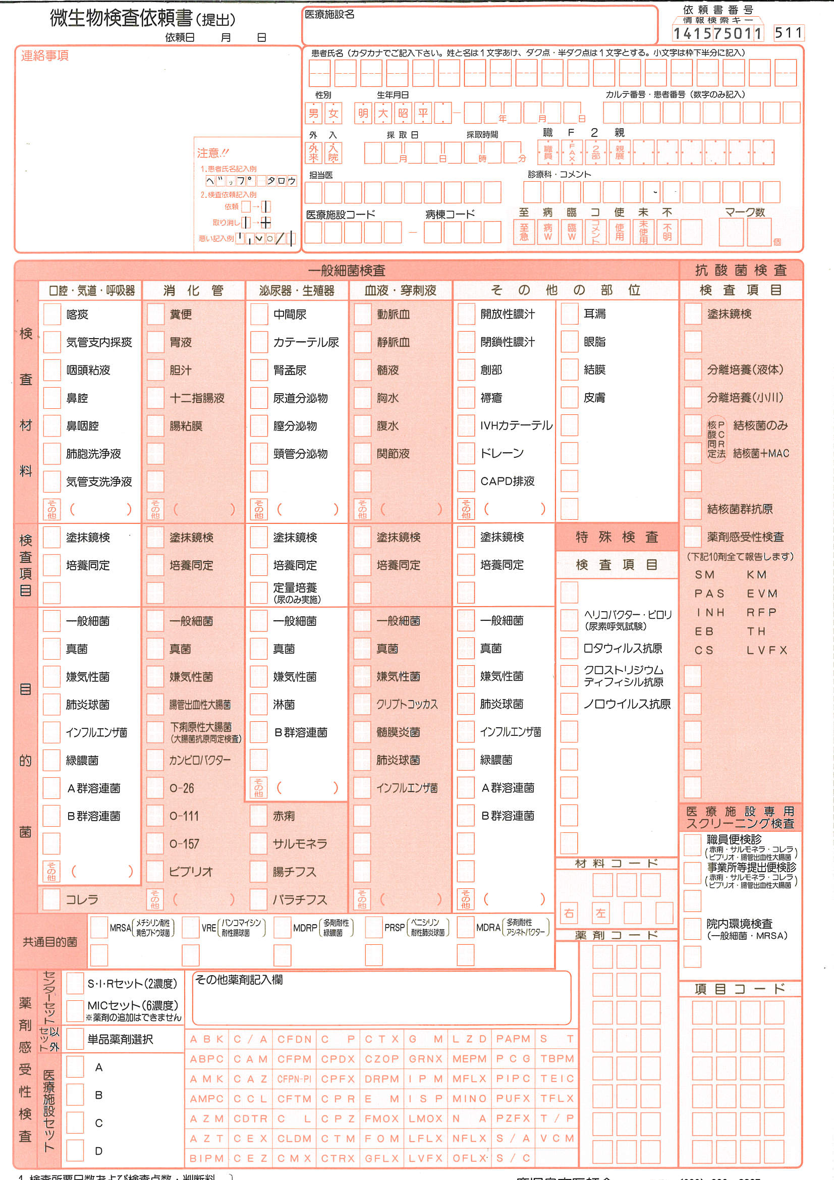 記入方法や詳細はこちら「(検査依頼方法(検査依頼書/臨床検査依頼書の説明)」をご覧ください。