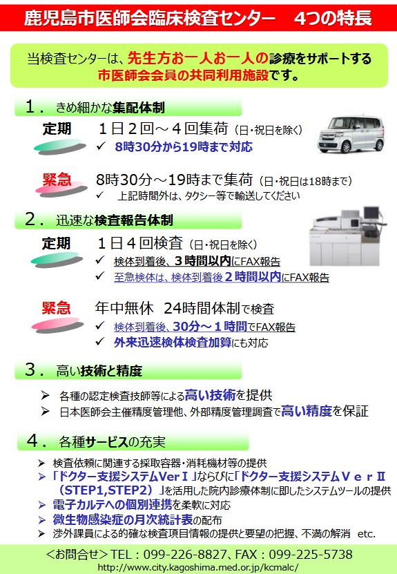 鹿児島市医師会臨床検査センターは会員の医療機関のお役に立てるよう努力しています。